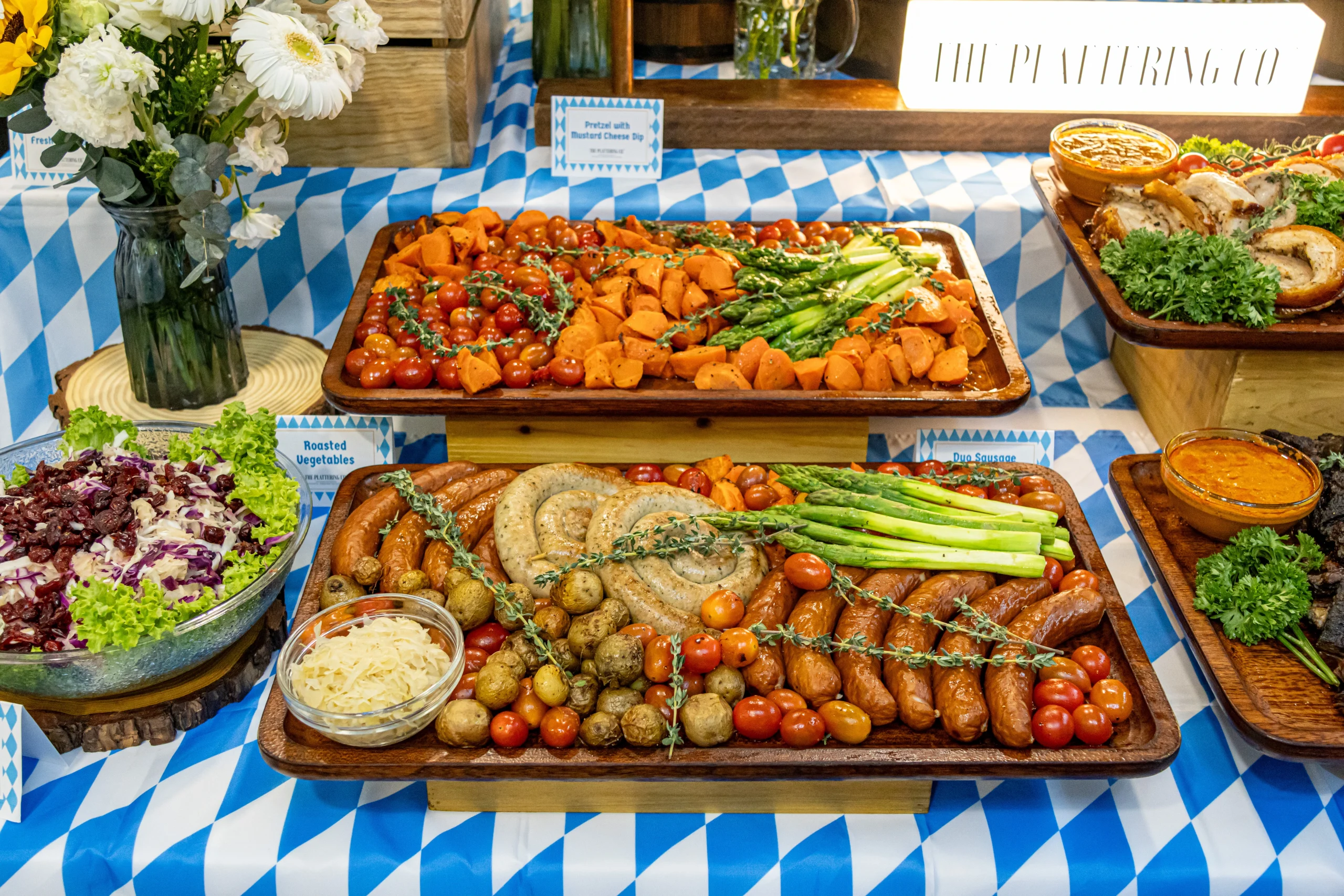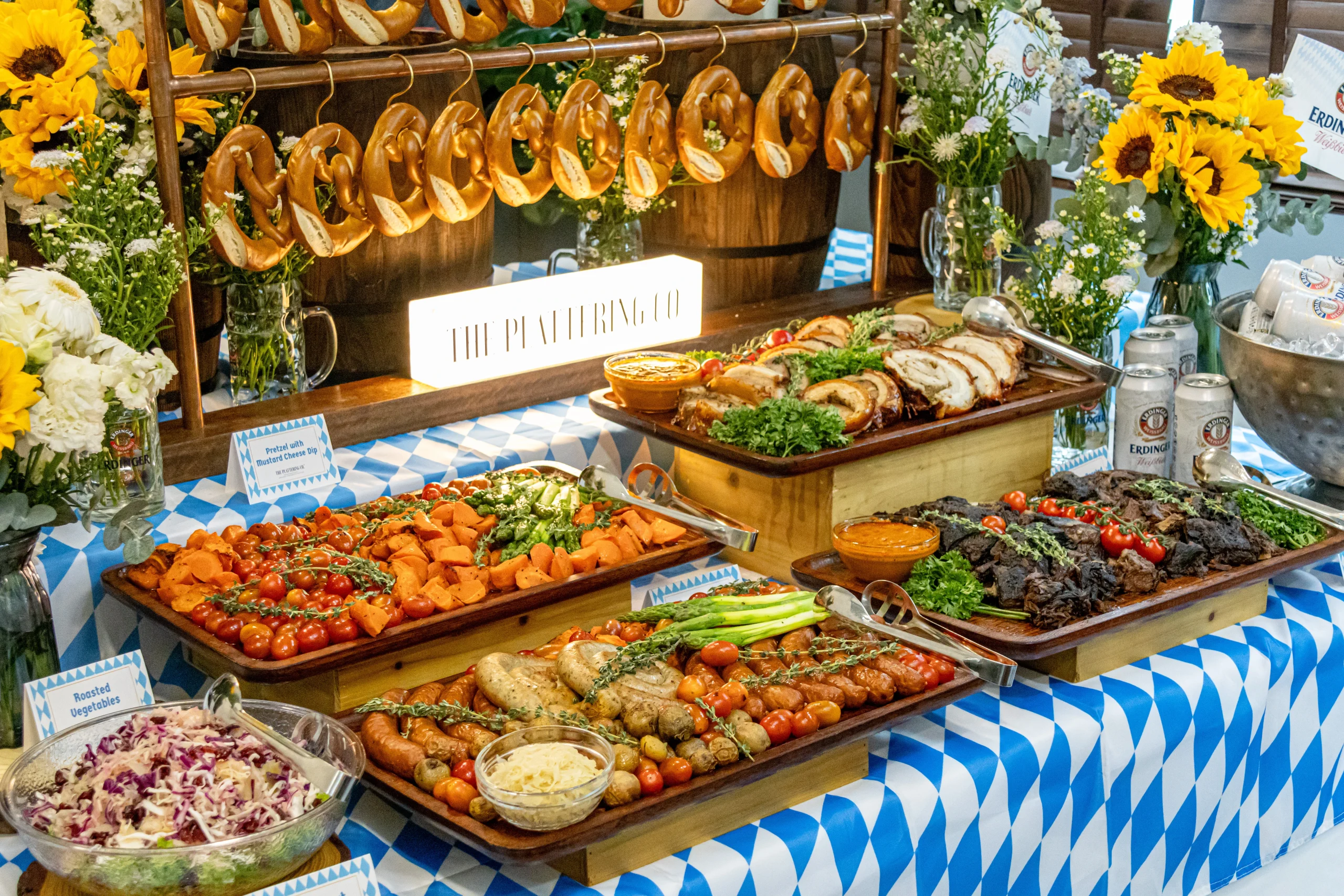 Designed to serve up to 20 guests, this fully styled buffet comes complete with rustic decorative touches and a charming centrepiece, making it as beautiful as it is bountiful. Pretzels are strung on pipe wall, all curated to capture the spirit of a true Oktoberfest feast.